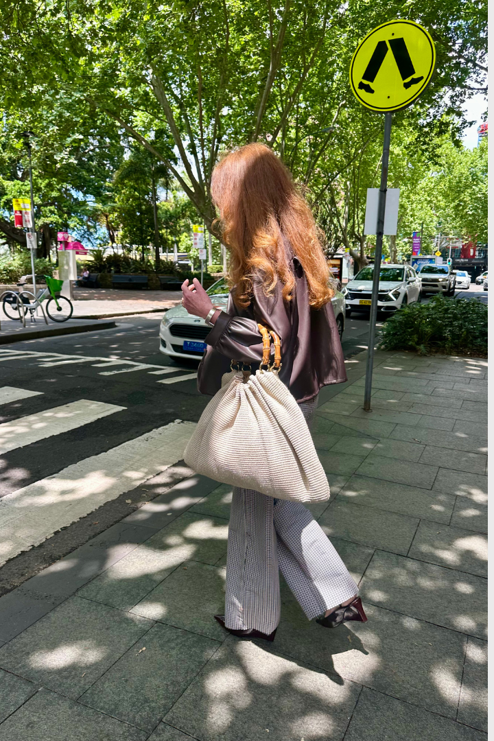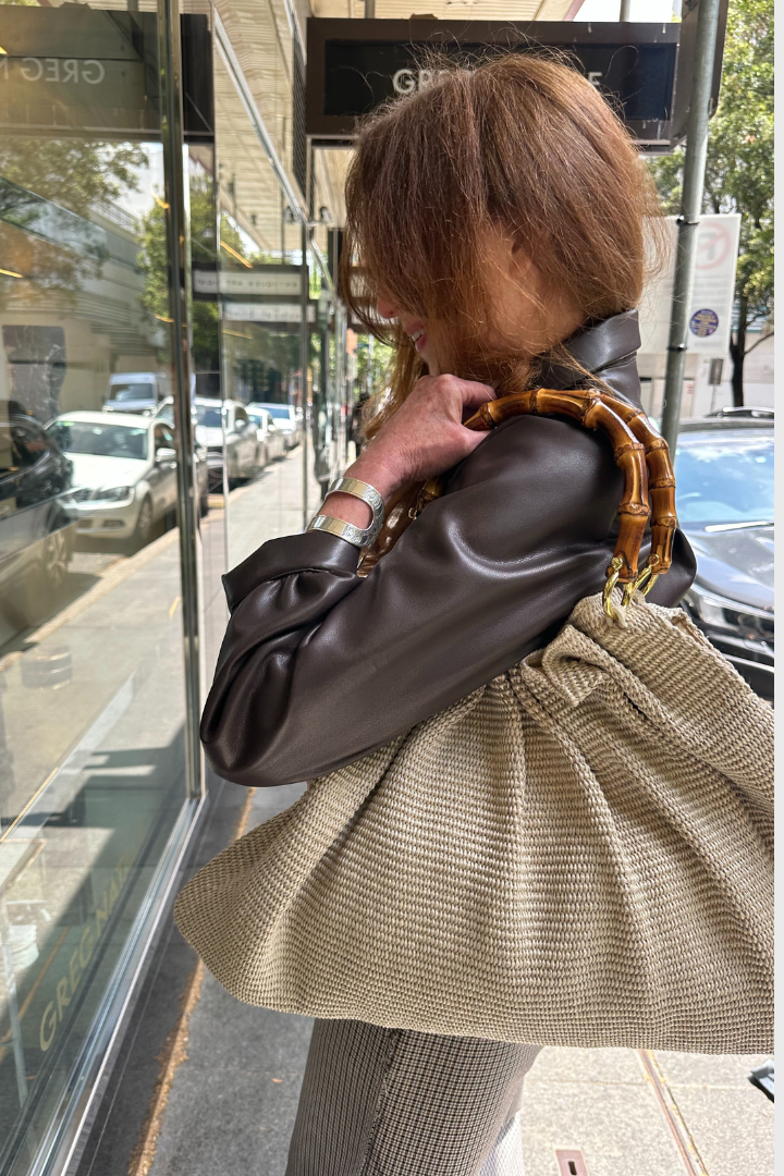 Elevate your everyday style with this gorgeous slouchy handbag, a true expression of Italian luxury and craftsmanship. Entirely handcrafted by artisans in Firenze Italy, its distinctive silhouette and real bamboo circular handles embody timeless sophistication and natural elegance.