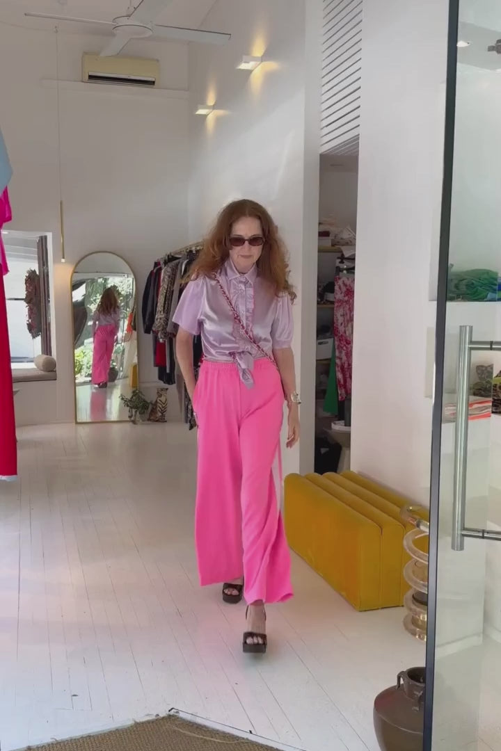This lilac silk satin shirt is designed to bring softness and structure into perfect harmony. Cut from lustrous silk satin, it features delicate ruffle detailing highlighted with a beautiful pink stitch - an elegant contrast that elevates the silhouette.