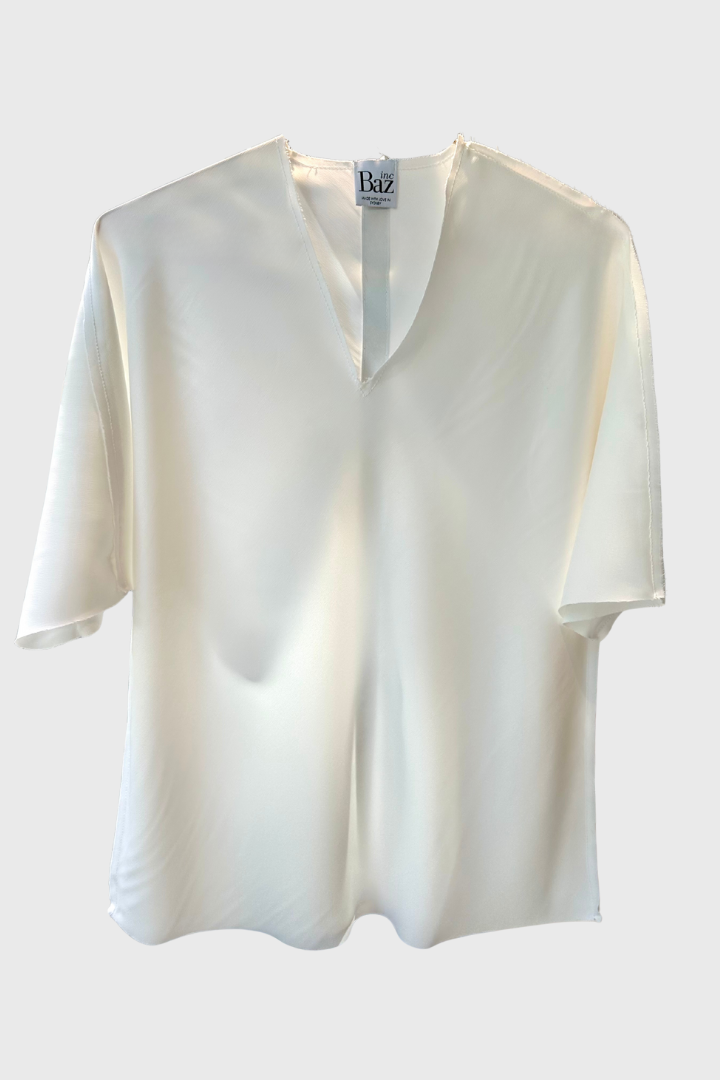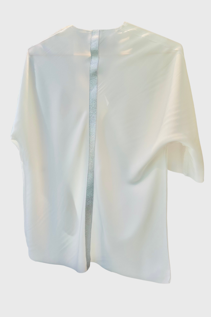 A modern wardrobe essential with a subtle twist. This crisp white top is elevated by a sleek metallic silver stripe running down the back, adding a touch of understated glamour to an everyday silhouette. Crafted from a lightweight, breathable fabric, it’s designed with a relaxed fit that drapes beautifully - easy to style for both day and evening.